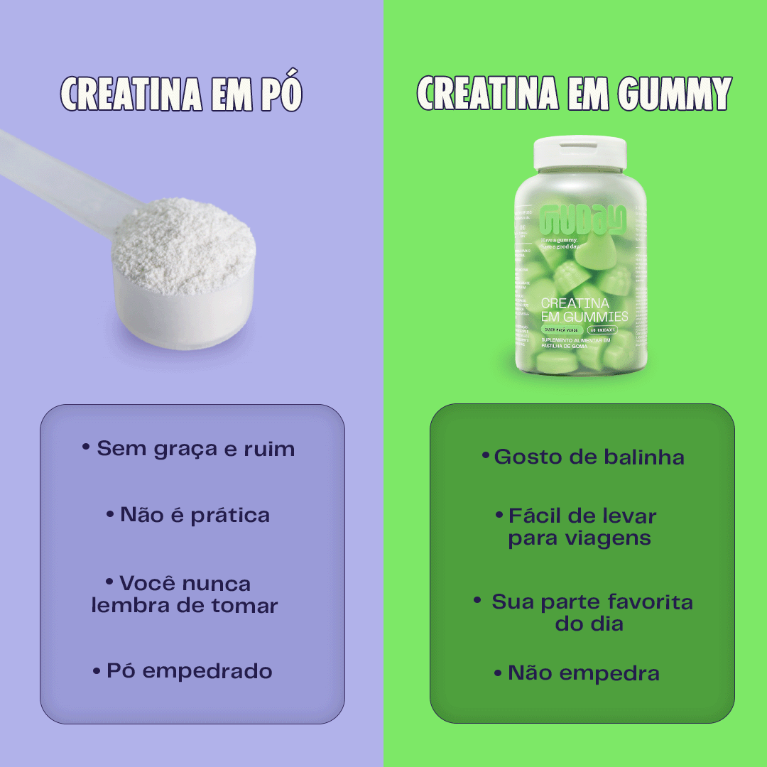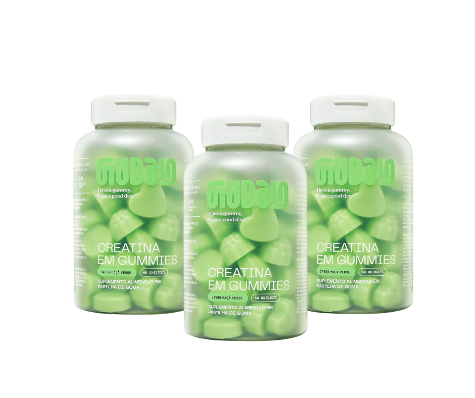 A Guday é a melhor amiga da sua melhor versão. Nossas gummies de creatina são super práticas, além de saborosas. Temos tudo o que a creatina em pó já tem - menos as partes ruins. 🍏